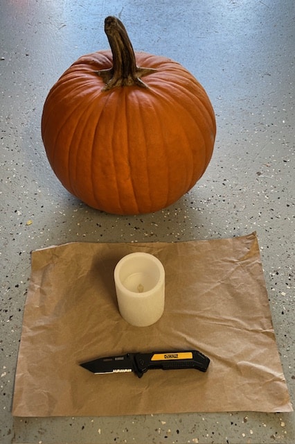 Citrouille, couteau bien aiguisé, cuillère, cutter, marqueur, bougie scintillante (à piles), marqueur, papier, plastique transparent (protège-page), ciseaux, ruban adhésif.
