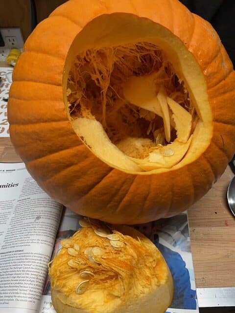 - Découpez le fond de votre citrouille et retirez les graines.